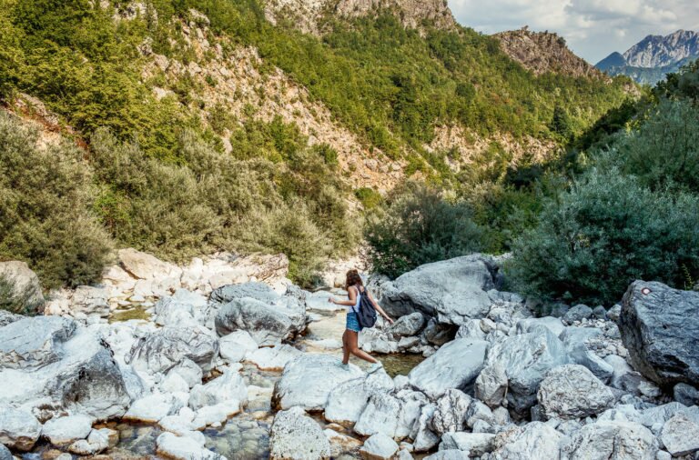 Wir wandern vorbei an Waldstücken mit urigen Buchen und Ufern, die zum Baden einladen. Das Wasser ist glasklar und wunderschön, aber auch eiskalt. Und damit meine ich wirklich eiskalt. Wir schätzen, dass es circa zehn Grad hat. Trotzdem kühlen wir uns dreimal ab. Wer braucht schon surrende Klimaanlagen, wenn man in einen Wildbach springen kann?